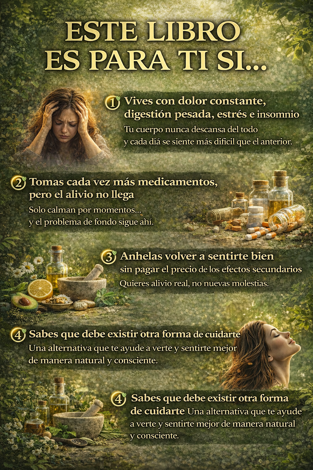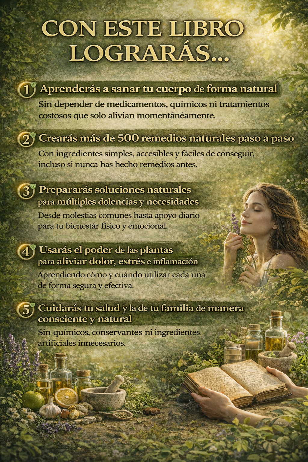 No. El libro ofrece alternativas naturales y complementarias para el bienestar diario. No sustituye diagnósticos ni tratamientos médicos profesionales.
