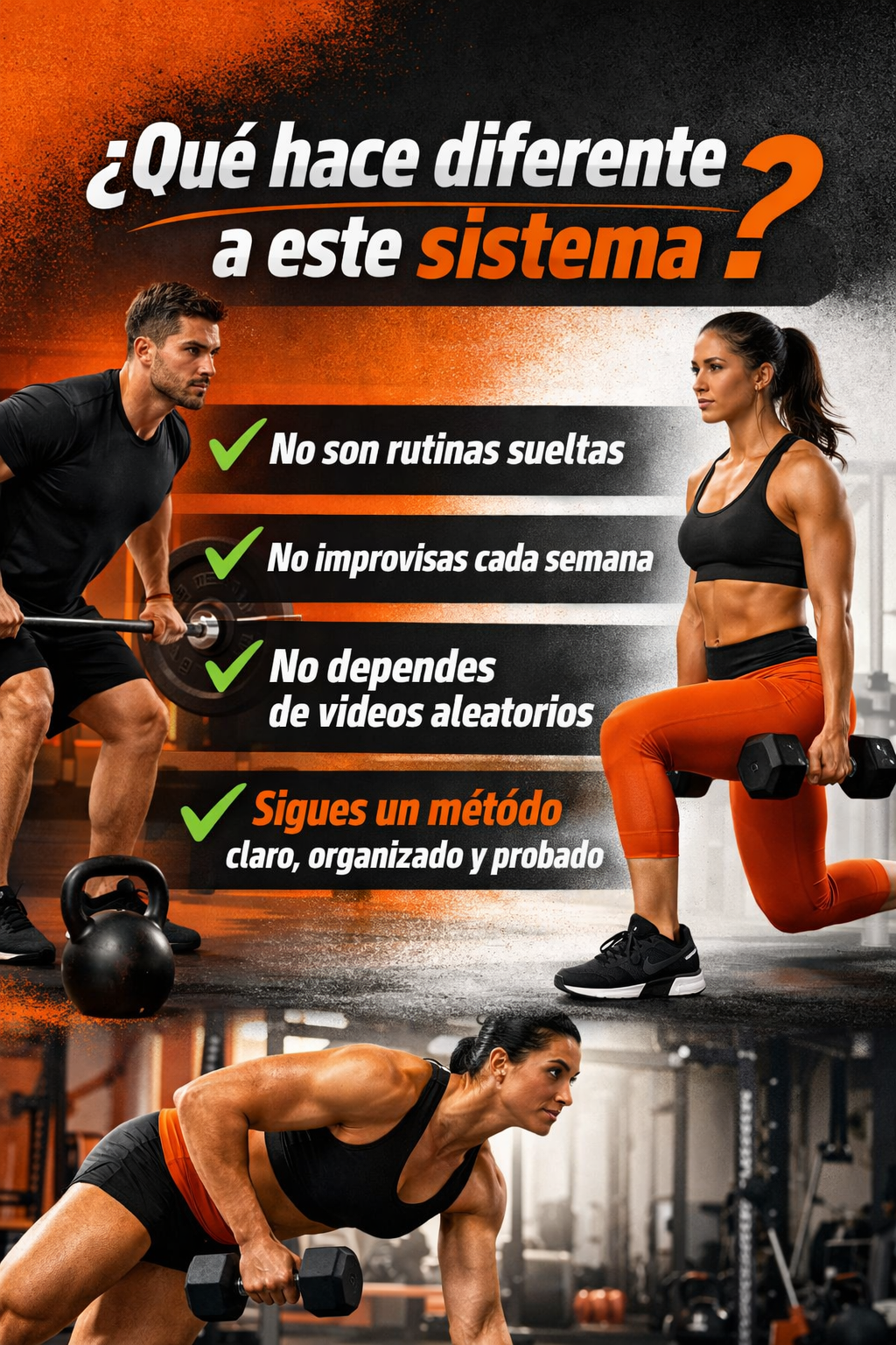 El sistema incluye rutinas que pueden realizarse en el gimnasio o desde casa, con opciones de adaptación según el equipamiento disponible
